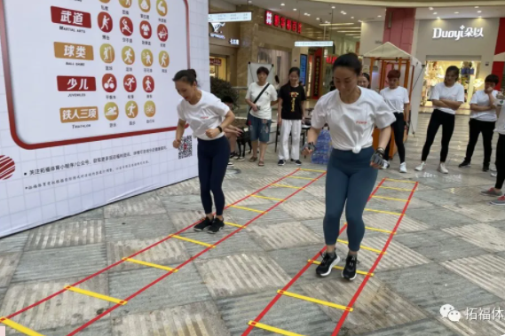 在活動(dòng)當(dāng)天現(xiàn)場(chǎng),舞臺(tái)上明星教練們激情燃脂,舞臺(tái)側(cè)方的敏捷梯競(jìng)速賽也在不斷進(jìn)行中,許多觀眾紛紛加入競(jìng)速賽的隊(duì)伍中!